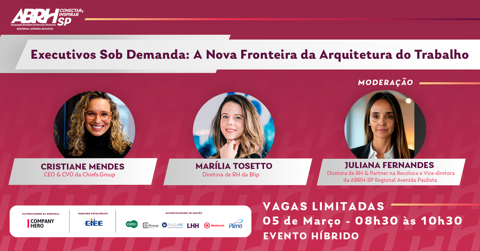 Mediando o evento, teremos Juliana Fernandes, Diretora de Recursos Humanos & Partner na Recoloca e Vice-diretora da ABRH-SP Regional Avenida Paulista, que conduzirá os debates com o olhar apurado de quem vive o RH estratégico no dia a dia.