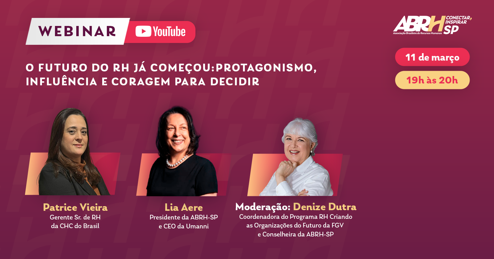 Votado a líderes e profissionais de RH, o webinar tem participações confirmadas de Lia Aere, presidente da ABRH-SP e CEO da Umanni, e de Patrice Vieira, executiva de Recursos Humanos com mais de 15 anos de atuação estratégica na América do Sul que atualmente atua como gerente sênior de RH na CHC do Brasil, empresa global especializada em transporte offshore, operações de busca e salvamento e serviços médicos de emergência.